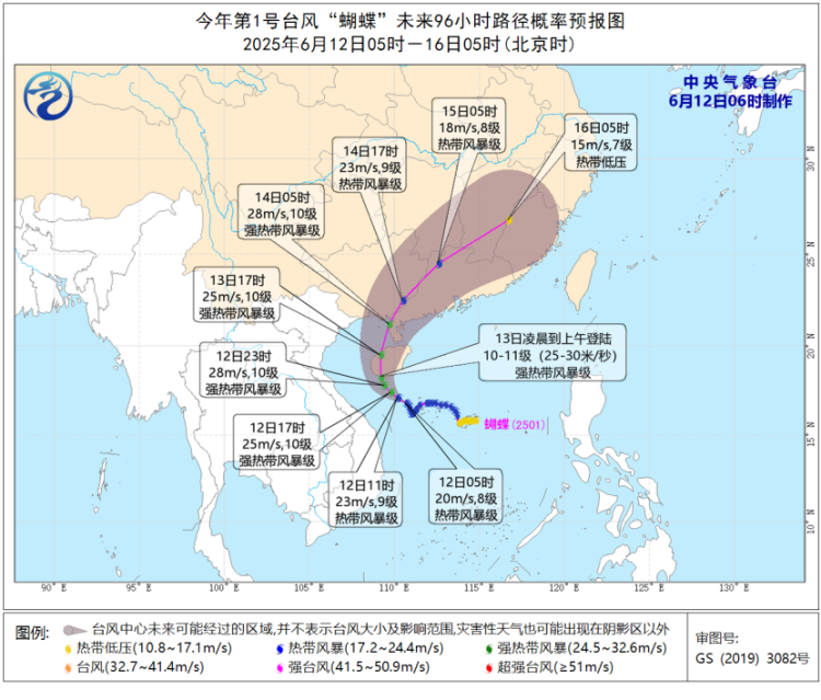 受其影响,预计6月12日至14日,华南大部将有大到暴雨,局地大暴雨或特大暴雨。其中,6月12日08时至13日08时,广东北部和中西部沿海、海南岛大部、台湾岛有大雨或暴雨,其中,海南岛东南部和台湾岛东南部的部分地区有大暴雨(100~150毫米);南海大部、北部湾、琼州海峡、西沙群岛、南沙群岛、中沙群岛、广东沿海、海南岛沿海、广西沿海将有6~8级风,阵风9~10级,台风中心经过的附近海域风力可达9~11级,阵风12~13级。